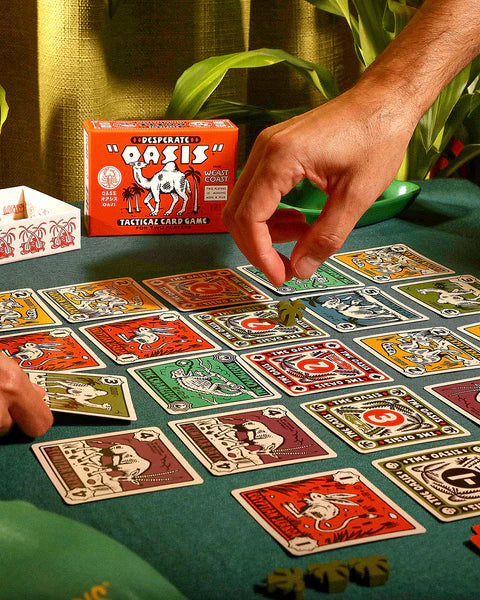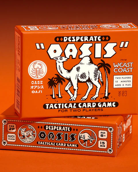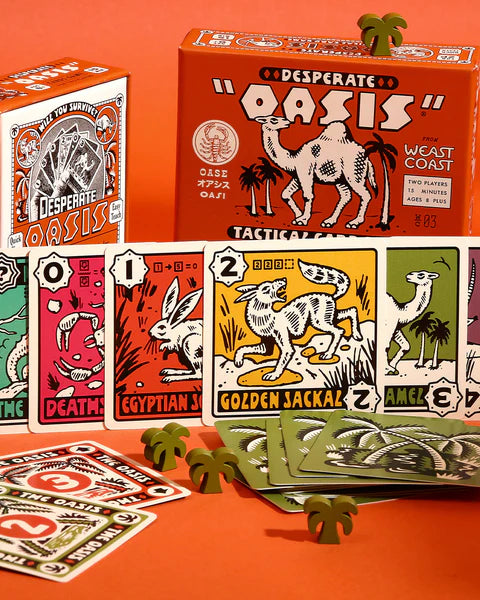 In Desperate Oasis, two players battle for control over lush, life-sustaining sanctuaries of the desert. By playing and grouping animal cards, players can show their strength, unlock special powers, and use palm trees to increase card values. Special spatial rules pull similar animals together, allowing for manipulation of card positions. Whoever has the most points after three rounds rules the desert!